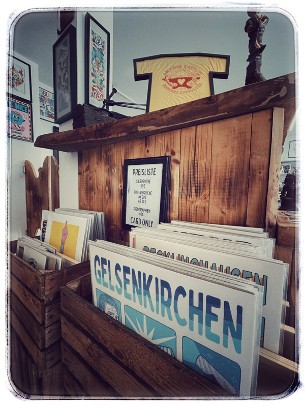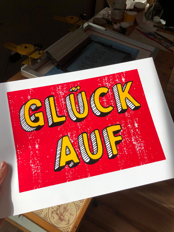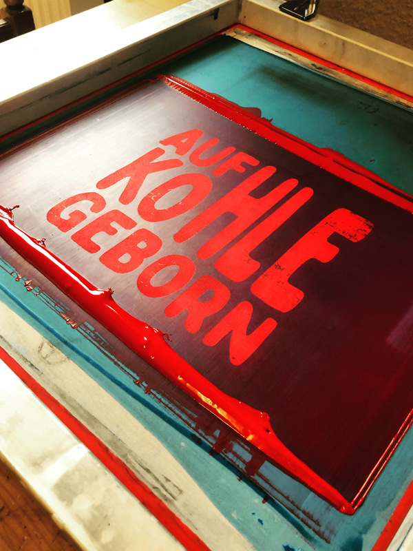 Der tricky part ist die Präzi­sion. Jede Farbe hat ihr eigenes Sieb. Eine Farbe zu druck­en, das Sieb wegzunehmen, ein weit­eres für die näch­ste Farbe anzuset­zen, dies 4 × zu wieder­holen und es hinzubekom­men, dass es zum Teil mil­lime­ter­ge­nau Passend ist das, ist die Her­aus­forderung. Vor allem mit meinen Möglichkeit­en, die nach wie vor im DIY-Bere­ich sind. Die ersten waren zwar 2‑farbig, aber bei den Designs war es nich sooo wichtig, ob es pass­ge­nau is. Wobei es bei meinen Prints „Han­si“ – „Herz auf der Zunge“ oder „Glück Auf“ entschei­dend ist, dass die Farbe an der Stelle ist, an der sie hinge­hört.